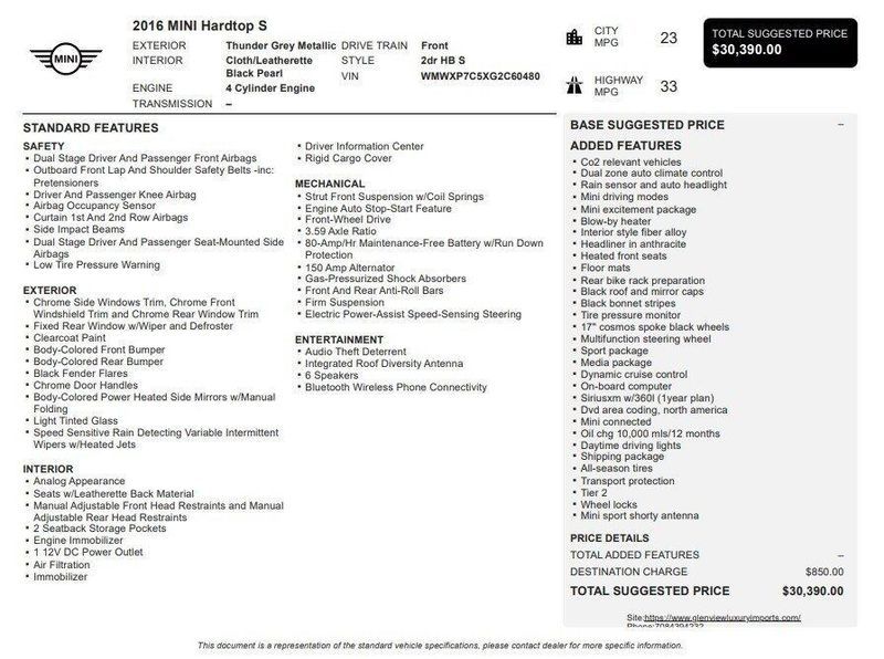 2016 MINI Cooper S Base FWD 2.0L 16V TwinPower Turbo Thunder Gray Metallic Navigation, Heated Seats, Center Armrest, Dynamic Damper Control, Enhanced USB & Bluetooth, LED Fog Lights, LED Headlights, Media Package, MINI 6.5 Visual Boost Screen, Navigation System, Sport Package, Wheels: 17 x 7 Tentacle Spoke Silver, White Turn-Signal Lights. Recent Arrival! 23/33 City/Highway MPGAwards:* JD Power Vehicle Dependability Study * JD Power Vehicle Dependability Study (VDS), Vehicle Dependability Study (VDS) * JD Power Vehicle Dependability Study, Vehicle Dependability Study * 2016 IIHS Top Safety Pick+ * ALG Residual Value Awards, Residual Value AwardsOur goal is to make your luxury and exotic car buying and owning experience unlike any other major purchase. With an unmatched attention to detail, truly impressive product lineup, and unique access to OEM parts. We are equipped to provide the ultimate in customer service every time you visit. In fact don?t think of us as a dealership at all. We?re your personal automotive concierge that offers the driving experience that your lifestyle demands. At our dealership, you?ll find a solid selection. If you have any questions for us, you can always get in touch at (847) 904-1233.