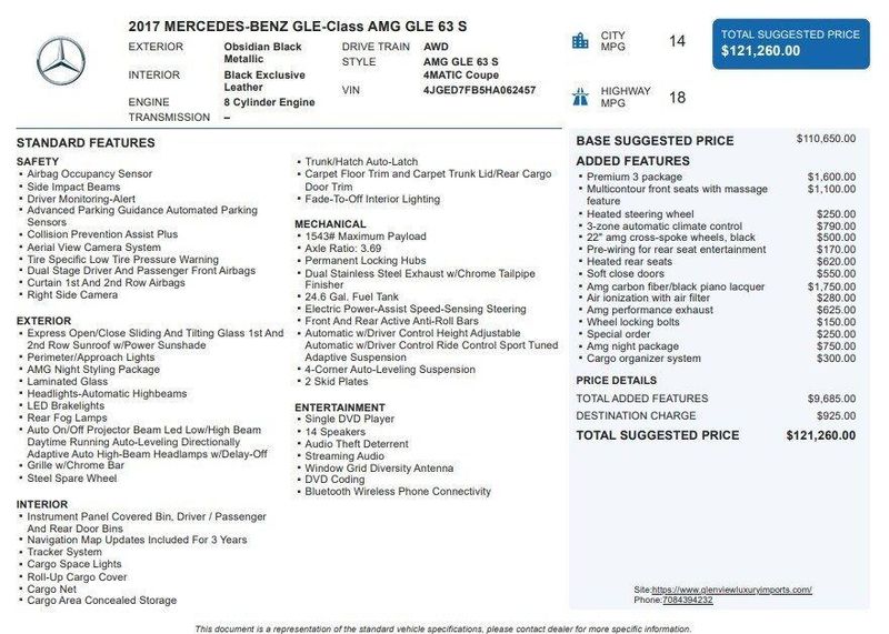 2017 Mercedes-Benz GLE 63 S AMG 4MATIC 4MATIC 5.5L V8 Direct-Injection BiTurbo Obsidian Black Metallic AWD, Navigation, Sunroof, Leather Seats, Heated Seats, Backup Camera, Memory Seats, Cooled Seats, 14 Speakers, ABS brakes, Active Blind Spot Assist, Active Lane Keeping Assist, Air Ionization w/Air Filter, Alloy wheels, AM/FM radio: SiriusXM, AMG Performance Exhaust, BAS PLUS, CMS Pedestrian, Compass, DISTRONIC PLUS w/Cross-Traffic Assist, Driver Assistance Package, DVD-Audio, Electronic Stability Control, Exclusive Nappa Leather Upholstery, Front dual zone A/C, harman/kardon Logic 7 Surround Sound System, Heated door mirrors, Heated front seats, Heated Rear Seats, Illuminated entry, Low tire pressure warning, Navigation system: COMAND APS, Night Package, Power Liftgate, Power moonroof, PRE-SAFE Brake w/Pedestrian Recognition, Premium 3 Package, Remote keyless entry, Soft Close Doors, Traction control.Awards:* 2017 KBB.com 10 Most Fun SUVs * 2017 IIHS Top Safety Pick+Reviews:* Several engine choices; quiet, upscale and well-built interior with a roomy backseat; long list of standard safety and technology features. Source: EdmundsOur goal is to make your luxury and exotic car buying and owning experience unlike any other major purchase. With an unmatched attention to detail, truly impressive product lineup, and unique access to OEM parts. We are equipped to provide the ultimate in customer service every time you visit. In fact don?t think of us as a dealership at all. We?re your personal automotive concierge that offers the driving experience that your lifestyle demands. At our dealership, you?ll find a solid selection. If you have any questions for us, you can always get in touch at (847) 904-1233.