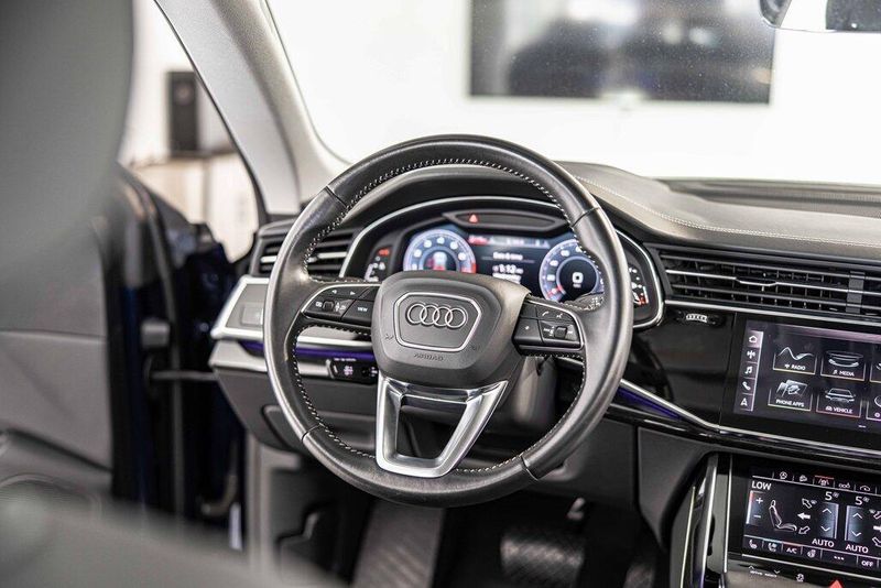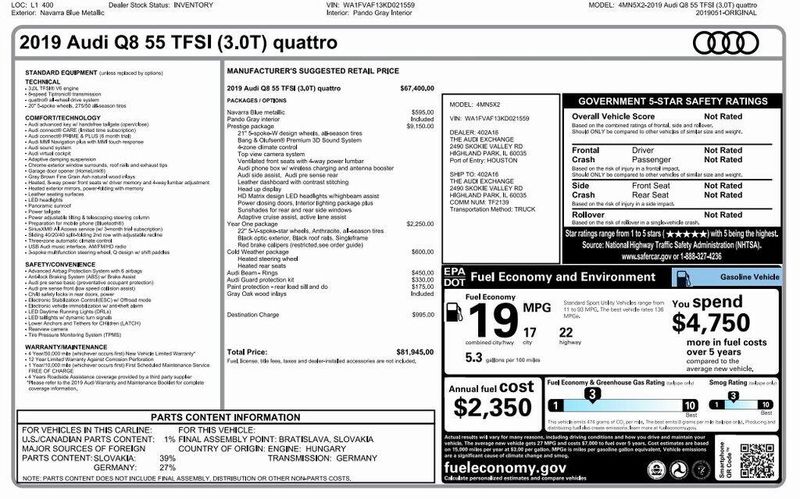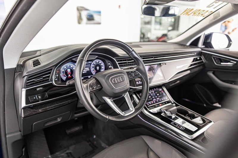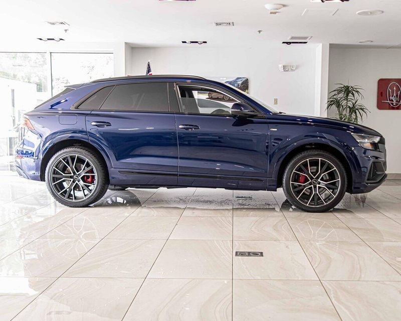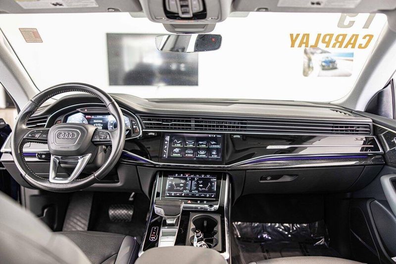 2019 Audi Q8 3.0T Prestige quattro quattro 3.0L V6 Turbocharged DOHC 24V LEV3-ULEV125 335hp Navarra Blue Metallic AWD, Navigation, Sunroof, Leather Seats, Heated Seats, Backup Camera, Memory Seats, Cooled Seats, Premium Sound System, Premium Audio, Multi-Zone Climate Control, 4-Zone Climate Control, Alu Touch-Sensitive Interior Buttons, Ambient Interior Lighting Plus Package, Audi Active Lane Departure Warning, Audi Adaptive Cruise Assist, Audi Phone Box w/Wireless Charging, Audi Side Assist w/Pre Sense Rear, Bang & Olufsen 3D Premium Sound System, Black Single Frame Mask, Convenience Package, Driver Assistance Package, Electric Sunblinds for Rear Side Windows, Front & Rear Doors Audi Beam-Rings, Front & Rear S line Bumpers, HD Matrix Design LED Headlights, Headlight Washer System, Heads-Up Display, Heated Power Folding Auto-Dimming Exterior Mirrors, High-Beam Assist, Illuminated Door Sills, Leather Dashboard, Navigation System, Power Door Closers, Prestige, Red Brake Calipers, S line Fender Badges, S line Illuminated Door Sills, Top View Camera System, Traffic Sign Recognition, Ventilated Front Seats, Wheels: 21 5-Spoke W-Design, Wheels: 22 Audi Sport 5-V-Spoke Star Design, Year 1 Package. Odometer is 35351 miles below market average!Awards:* 2019 KBB.com 10 Best Luxury SUVsOur goal is to make your luxury and exotic car buying and owning experience unlike any other major purchase. With an unmatched attention to detail, truly impressive product lineup, and unique access to OEM parts. We are equipped to provide the ultimate in customer service every time you visit. In fact don?t think of us as a dealership at all. We?re your personal automotive concierge that offers the driving experience that your lifestyle demands. At our dealership, you?ll find a solid selection. If you have any questions for us, you can always get in touch at (847) 904-1233.