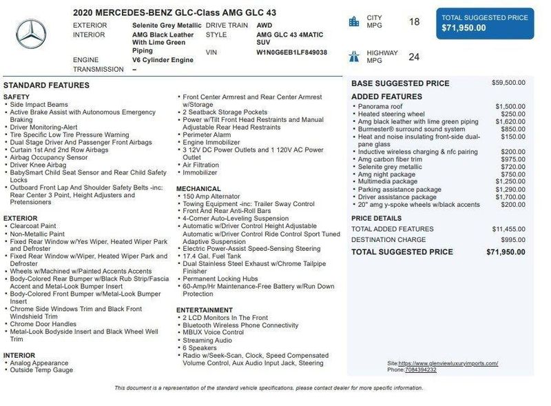 2020 Mercedes-Benz GLC 43 AMG 4MATIC 4MATIC V6 Selenite Gray Metallic One Owner, Clean CARFAX, AWD, Navigation, Sunroof, Leather Seats, Heated Seats, Backup Camera, Memory Seats, Premium Sound System, Premium Audio, Multi-Zone Climate Control, Bluetooth, Hands-Free, USB Port, Portable Audio Connection, Apple CarPlay/Android Auto, Steering Wheel Controls, 10.25 Center Media Display, 6 Speakers, Active Blind Spot Assist, Active Lane Keeping Assist, Active Speed Limit Assist, Air Conditioning, AM/FM radio: SiriusXM, AMG Night Package, Android Auto, Apple CarPlay, Augmented Reality, Automatic temperature control, BAS PLUS w/Cross-Traffic Assist, DISTRONIC PLUS w/Steering Assist, Driver Assistance Package, Driver Assistance Package Plus, Front Bucket Seats, Front Center Armrest, Front dual zone A/C, Gloss Black Roof Rails, HANDS-FREE ACCESS, HANDS-FREE ACCESS Package, Heated front seats, Live Traffic, MB Hard-Disc Navigation, MBUX Voice Control, Memory seat, Multimedia Package, Navigation Services, Panorama Roof, Parking Assistance Package, Parking Package, PARKTRONIC w/Active Parking Assist, Power driver seat, Power Driver Seat & Steering Column w/Memory, Power steering, Power windows, PRESAFE Brake w/Pedestrian Recognition, PRESAFE PLUS, Radio data system, Radio: MBUX Multimedia System, Radio: MBUX Premium Multimedia System, Rear Cross-Traffic Alert, Rear window defroster, Remote keyless entry, SiriusXM Satellite Radio w/Free Trial Term, Smartphone Integration, Speed Limit Assist, Steering wheel memory, Steering wheel mounted audio controls, Surround View System, Wheels: 20 AMG Y 5-Spoke w/Black Accents.Our goal is to make your luxury and exotic car buying and owning experience unlike any other major purchase. With an unmatched attention to detail, truly impressive product lineup, and unique access to OEM parts. We are equipped to provide the ultimate in customer service every time you visit. In fact don?t think of us as a dealership at all. We?re your personal automotive concierge that offers the driving experience that your lifestyle demands. At our dealership, you?ll find a solid selection. If you have any questions for us, you can always get in touch at (847) 904-1233.