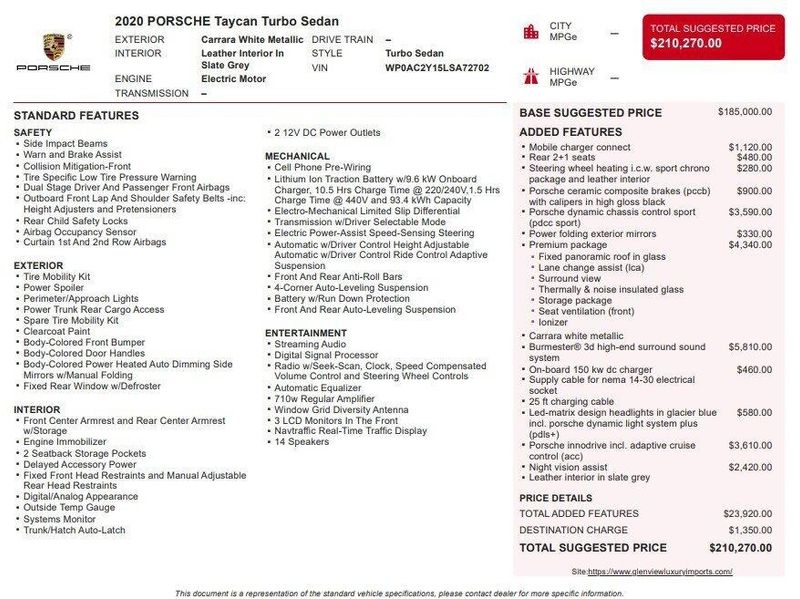 2020 Porsche Taycan Turbo S AWD Electric Motor Carrara White Metallic Clean CARFAX, AWD, Navigation, Sunroof, Leather Seats, Heated Seats, Backup Camera, Memory Seats, Cooled Seats, Premium Sound System, Premium Audio, Multi-Zone Climate Control, Bluetooth, Hands-Free, USB Port, Portable Audio Connection, Apple CarPlay/Android Auto, 18-Way Adaptive Sport Seats w/Memory Package, ABS brakes, Alloy wheels, Burmester High-End Surround Sound System, Compass, Electronic Stability Control, Fixed Panoramic Roof in Glass, Front & Rear ParkAssist w/Surround View, Front dual zone A/C, Heated door mirrors, Heated front seats, Heated rear seats, Illuminated entry, Ionizer, Lane Change Assist (LCA), Low tire pressure warning, Navigation System, Navigation system: Porsche Communication Management (PCM), On-Board 150 kW/400V DC Charger, Porsche Ceramic Composite Brakes (PCCB) (1LX), Porsche Communication Management, Porsche InnoDrive w/Adaptive Cruise Control (ACC), Premium Package, Rear 2+1 Seats, Remote keyless entry, Storage Package, Supply Cable for NEMA 14-30 Electrical Socket, Thermally & Noise Insulated Glass, Traction control, Wheels: 21 Mission E Design.Our goal is to make your luxury and exotic car buying and owning experience unlike any other major purchase. With an unmatched attention to detail, truly impressive product lineup, and unique access to OEM parts. We are equipped to provide the ultimate in customer service every time you visit. In fact don?t think of us as a dealership at all. We?re your personal automotive concierge that offers the driving experience that your lifestyle demands. At our dealership, you?ll find a solid selection. If you have any questions for us, you can always get in touch at (847) 904-1233.