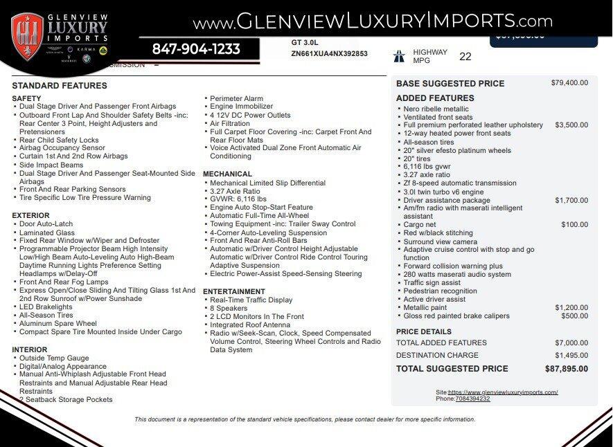 2022 Maserati Levante GT AWD 3.0L V6 Nero Ribelle Metallic Clean CARFAX, AWD, Navigation, Sunroof, Leather Seats, Heated Seats, Backup Camera, Memory Seats, Premium Sound System, Premium Audio, Multi-Zone Climate Control, Bluetooth, Hands-Free, Adaptive Cruise Control w/Stop & Go Function, Driver Assistance Package, Forward Collision Warning Plus, Full Premium Perforated Leather Upholstery, Gloss Red Painted Brake Calipers, Heated front seats, Leather Upholstery, Memory seat, Navigation System, Power driver seat, Power passenger seat, Power steering, Power windows, Remote keyless entry, Split folding rear seat, Steering wheel memory, Steering wheel mounted audio controls, Surround View Camera, Ventilated Front Seats. Recent Arrival! Odometer is 584 miles below market average!Our goal is to make your luxury and exotic car buying and owning experience unlike any other major purchase. With an unmatched attention to detail, truly impressive product lineup, and unique access to OEM parts. We are equipped to provide the ultimate in customer service every time you visit. In fact don?t think of us as a dealership at all. We?re your personal automotive concierge that offers the driving experience that your lifestyle demands. At our dealership, you?ll find a solid selection. If you have any questions for us, you can always get in touch at (847) 904-1233.
